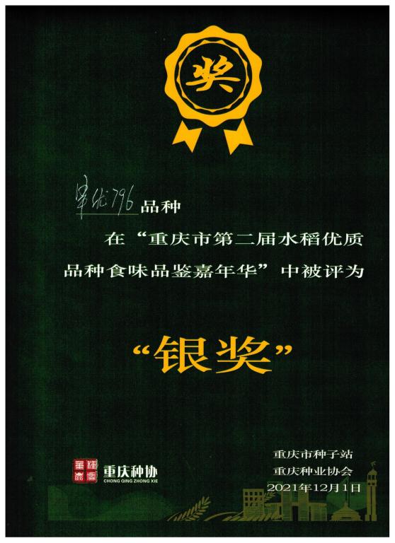 betway西汉姆联旱优796喜获重庆市水稻优质品种食味鉴评银奖
