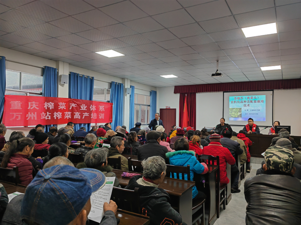 2023年12月29日,蔬菜室在茎瘤芥(榨菜)核心产区万州区甘宁镇庙沟村开展宜机化高产技术培训,以一场技术盛宴辞旧岁、迎新年,为万州区榨菜高质量发展提供动力。从事榨菜生产的专业合作社、种植大户、普通农户130余人参加培训。