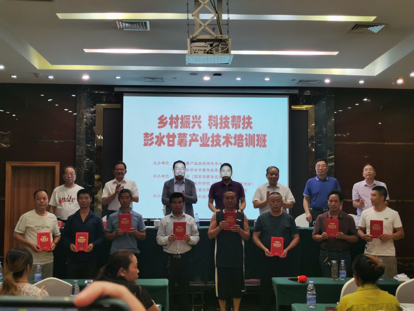 培训班邀请国家甘薯产业技术体系对接帮扶彭水的良种繁育、农机农艺、产品研发、品牌培育等方面的21位岗位科学家和试验站站长,采用腾讯视频和会议现场的线上线下结合方式,对彭水县郁山镇、新田镇、石柳乡等7个乡镇的48名甘薯种植大户、加工主体开展全面系统的集中培训,专家分别从健康种薯种苗繁育、高效栽培、病虫害防控、机械化种植、产后加工、产业经济经营模式等甘薯生产加工全产业链授课,线上线下累计培训1500余人次。国家甘薯产业技术体系首席科学家李强研究员,中国作物学会甘薯专业委员会主任马代夫研究员亲临现场授课,并为现场通过结业考试的学员颁发结业证书。