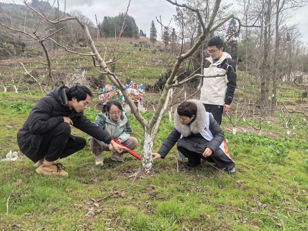 团队首先深入该村黄桃种植基地,对黄桃树的生长情况进行了全面的观察,针对其树体枝梢分布过密的问题,提出了优化树体结构的建议,强调了疏除过密的结果枝、合理负载对于提升果实大小和品质的重要性,并对如何疏枝进行了详细的技术指导。在病虫害防控方面,团队根据果园的实际情况,详细介绍了春季树体生长的特点以及病虫害防控的关键措施,特别是针对去年春季果园爆发的缩叶病,详细讲解了病菌的生长繁殖过程和易发病时间,明确了防控的关键时期,并推荐了有效的药剂,帮助他们科学应对病虫害挑战。